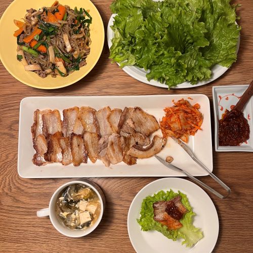 今まで、サムギョプサルは豚バラ肉の脂が多いからな~と敬遠していましたが、美味しいから食べに行こう!とのお誘いで、新大久保に行ってきました。食べたらすごーく美味しくて、しかも脂は流れ出るようになっているし、野菜もたっぷり食べることができるので、イメージと違って健康的じゃない?と思い、家でも真似してお肉を野菜で巻いて食べました。取り分ける食材は、大き目な長方形のプレートに盛ると場所も取らずに便利ですよ。