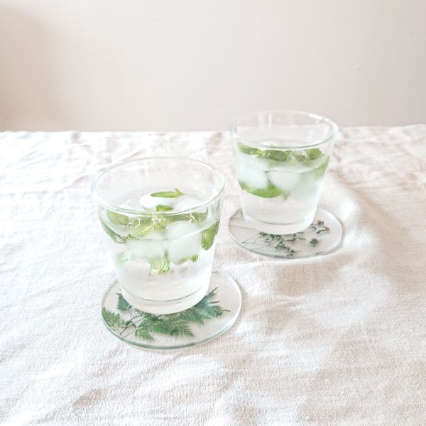 透明感が素敵なデザインのコースターを頂いたので、シンプルなカルティオのクリアと合わせてみました。イメージ通りのさわやかなコーディネートに大満足!暑い季節は見た目から涼しげな雰囲気にするのも大事ですね。