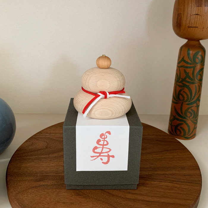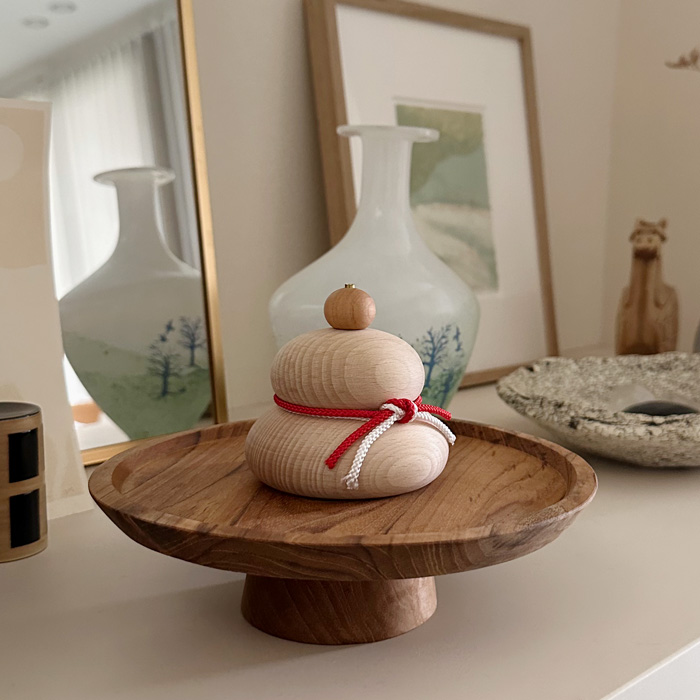 鏡餅を飾るときの台座として、のし付きの箱をお使いいただくこともできます。シックな色合いでまとめられ、静かな晴れやかさをまとっている鏡餅。玄関、リビング、食卓、子ども部屋など、飾りたいなぁと思う場所にすんなり溶け込んでくれるため、気軽に飾っていただけますよ。そうそう、木製の鏡餅は落としても割れにくいから、小さなお子さんがいらっしゃるご家庭にもおすすめです。