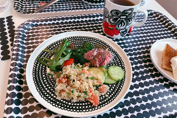 ペリカンのロールパンをお裾わけしてもらったので、たまごロールサンドにしてみました。マリメッコの食器はどれも印象的でかわいいお皿ばかりですよね。ご飯が負けちゃうかな?使いこなせるかな?と心配になりますが、いざ使ってみると食材の色が引き立ってとても使いやすいんです。赤や黄色、鮮やかな色の食材がとっても映えるプレートです。