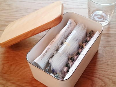 真っ白なホーローと木の組み合わせが気に入って買ったバターケース。いつも目にする所に置いておきたくて、薬ケースとして使うことにしました。シンプルでかわいいので出しておいても美しい。飲み忘れがなくなりました~♪
