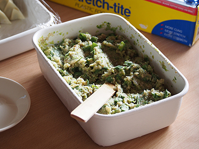 夕飯が餃子の時は出勤前に餃子の具だけ作って冷蔵庫へ。そして帰宅後ひたすら包みます。琺瑯の保存容器は冷蔵庫内でより冷えてくれるので、食品が傷みにくい気がします。今一番のお気に入りの餃子の皮は成城石井に置いてある八幡製麺所のもの。もっちりしていて美味しいですよ。