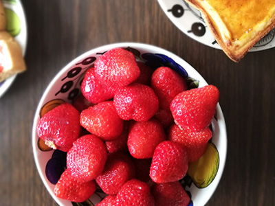 パラティッシに山盛りのイチゴ。テーブルがぱっと明るくなります。スープボウルはカラパラとブラパラ合わせて4つ持っています。柄が素敵なのはもちろん、カレーやシチュー、煮物やサラダと本当に使い勝手がいいので、友達のお祝いに送ったことも。ボウルは数個あっても邪魔にならないはず…!