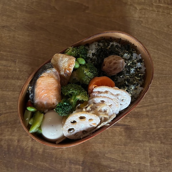 曲げわっぱのお弁当箱は、同じおかずでも他のお弁当箱に詰めるより何となくおいしそうに見える気がします。このお弁当箱は気が付いたら10年超えて使っていました。よく見ると経年変化が見られますが、まだまだ現役。入れるおかずも好きなものを入れることが多いのであまり変わり映えのしないお弁当ですが、これからも大事に使っていこうと思っています。