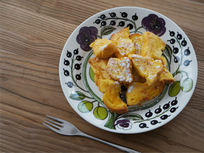 おやすみの日のブランチにはフレンチトーストをパープルパラティッシのプレートで。朝寝坊してしまった日はちょっともったいないことをしたなぁと後悔しがちなのですが、そんな思いも忘れさせてくれるような、見ていて気持ちのあがる1枚です。