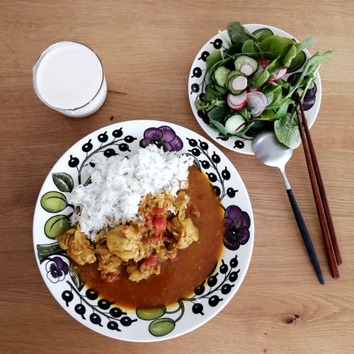 パープル パラティッシはクリスマスの食卓を厳かで華やかにしてくれます。スヌーピーの色どりが寂しかったのですが、瑞々しい絵柄が補ってくれました。カレーもごちそうに見えますね!
