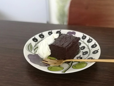 濃厚なチョコレートケーキ。やはりパープルパラティッシが似合います。冷蔵庫に残っていたクリームをぽてっと添えるつもりが、ちょっとよくばりすぎたかも。それでも、いつもより素敵なおやつになりました。