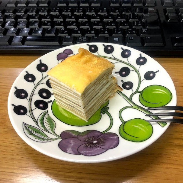 撮影用に作ったミルクレープのおすそわけが仕事中配られました。狭いデスク上ですがパープルパラティッシのプレートにおかれているだけで、食べている間だけでもゆったりとできるのは気のせいでしょうか。せっかくなのでコーヒーだけは新しく入れて美味しくいただきました。プレート1枚でゆったりした気分になれるパラティッシってすごいですよね。