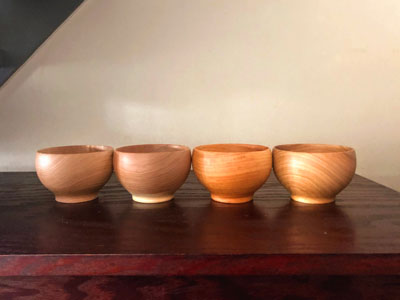 いろいろ使ってみたくて家族4人分、4種類のお椀にしました。左から、くり、くるみ、けやき、さくらです。それぞれ節があったり、色むらがあったり、もともとの色も木目も様々ですが大事に使って何年後かに同じように並べて色の変化を見てみたいと思ってます。