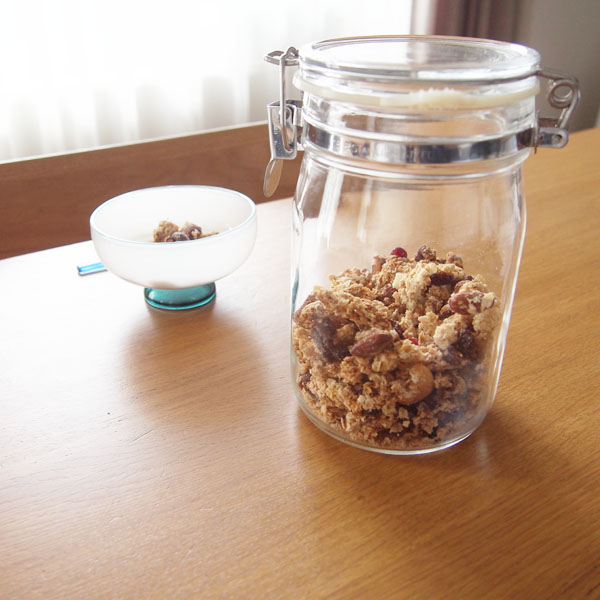 セラーメイトの瓶は主に梅仕事の時期メインに活躍しますが、それ以外のシーズンにもピクルスを漬けたり、ドライフルーツやナッツの保存にも重宝。なかしましほさんのレシピで作ったグラノーラもぴったり収まりました。自家製だとよくスーパーで売っているグラノーラよりも甘さ控えめにできるのがうれしいです。おいしくって瓶いっぱいに作ったはずがあっという間に減ってしまいました(汗)。瓶の口が広いのでグラノーラをすくうときに家事問屋のスコップが難なく入って快適です。