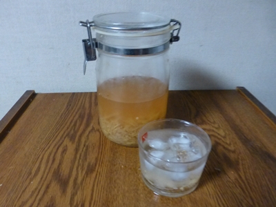 いつも梅シロップは4Lの瓶で漬け、砂糖が溶けたら梅の実を取り出してシロップはこの1Lの瓶に入れます。1Lの瓶は冷蔵庫に入るのでシロップの保存に最適です。梅仕事のものだけでなく、ピクルスを大量につける時にも使います。右側は7年ものの梅酒です。