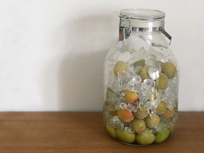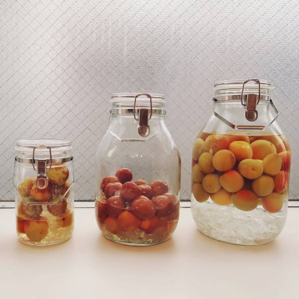 来日してから初めての梅仕事です。梅酒と梅シロップ、両方作ってみました!今回使っている梅は青梅ではなく、南高梅です。左側は1L瓶です。元々はハチミツのレモン漬けに使いたかったのですが、梅酒を作るときに梅が余ったので、残りの300gを1L瓶に入れて梅シロップを作りました。真ん中は3L瓶です。梅800g、氷砂糖800gを入れました。写真は漬けて3日後の様子。少ししわが出てきました。右側の方は4L瓶です。梅1.3kg、氷砂糖1.3kg、ホワイトリカー1.8Lが入っています。ちょうどいいサイズだと思います。桃色の梅シロップの出来上がりが楽しみです!