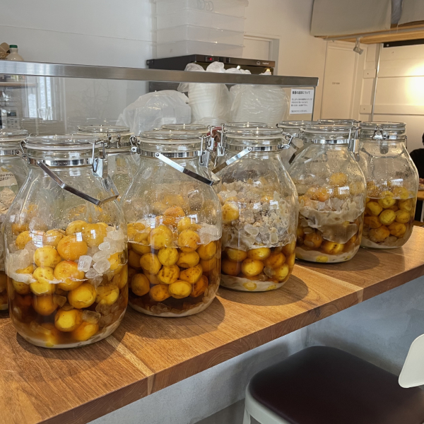 キャロットケーキがおいしい、新しい事務所近くにあるカフェにズラッと並んだ仕込み中の梅シロップ達。瓶はセラーメイトだって一目でわかっちゃう職業病の悲しさよ。こんなにたくさんのヘタ取りをされたのねと思うと、「お疲れ様です!」という気持ちか湧いてきて、つい話しかけてしまいました。写真撮影を快く承諾してくださったついでに割と熟れている梅を使う理由をお聞きしたのですが、お店の方もいつもこの色で作っているから、逆に青梅で漬けてみたことがないとのこと。完成したであろう梅シロップがなくなる前に味を確かめに行かねば!