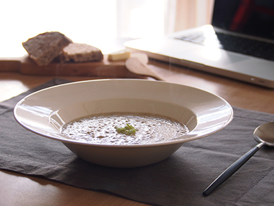 在宅勤務の日のお昼ごはんは、昨晩の残り物を温めて簡単に済ませます。今日はごぼうのポタージュとお取り寄せしたカンパーニュを2切れ。リムの大きなこのディーププレートに盛りつけるだけで、残り物がきちんとした一品料理に早変わり!パスタもちょっと山高に盛りつけると素敵に変身しますよ。