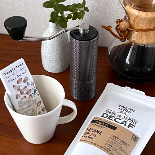 たっぷり入るのにすっきりシェイプのココのマグは、手のおさまりが良く、かわいいんです。お供のチョコには、ピープルツリーの「ホワイト・アーモンド」を。ホワイトチョコは苦手だけど、ピープルツリーのものは甘すぎず、これはアーモンドも入っているのでお気に入り。そしてコーヒー好きな人にも満足していただけるデカフェ豆「イノセントコーヒー」もお勧めです。飲みすぎてしまう人も、午後はデカフェに変えてみましょう。バレンタインにセットでプレゼントしても喜ばれるはずです♪こだわり派にはタイムモア コーヒーグラインダーで豆から挽いて。すべらずにしっかりと握れ、軽く挽けるのでストレスフリーです。