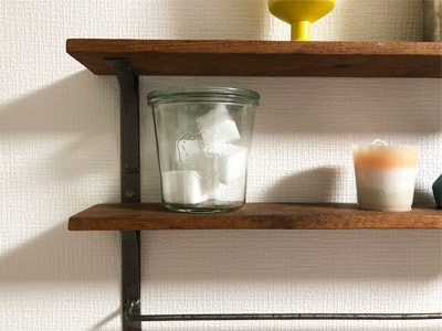 シンク周りのお掃除や、食器の茶渋を綺麗にしてくれるメラミンスポンジ。ちょこちょこ使うのに、いちいちシンク下から取り出すのがめんどくさくなったので、シンク周りに置いていたのですが、一気に生活感だ漂う見た目に。なので、WECKのキャニスターに入れてみました!このすっきりとしたデザインに、500mlサイズが大きすぎず、小さすぎず、ちょうどいい!キッチンの飾り棚に置いてもおかしくないくらい、すんなり溶け込みました。