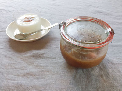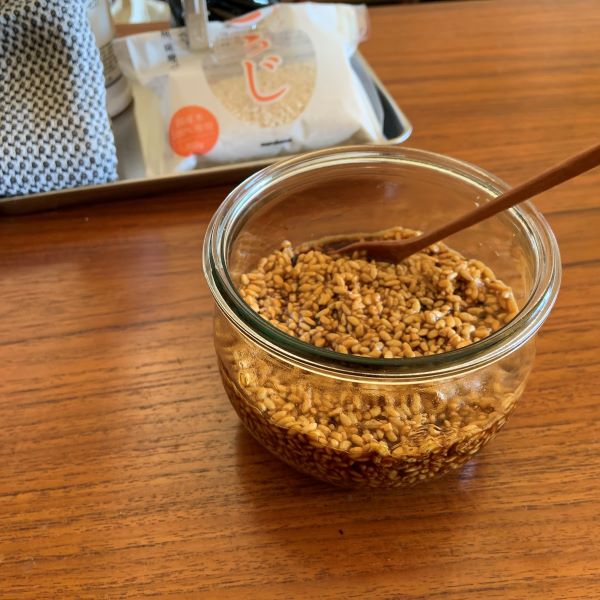 醤油麹の仕込みです。パストリーゼで消毒したWECKに乾燥米こうじと最近使い始めた醤油(スタッフ三木おすすめのフンドーキンの醤油)を1:1で入れてかき混ぜ、麹が醤油にヒタヒタに漬かるようにならして仕込みは完了。あとは常温保存で一日に一回空気を含ませるようにかき混ぜて一週間くらいで完成の予定です。ガラスの容器は中の様子がひと目でわかるから、醤油が足りないなぁというときの継ぎ足すタイミングも逃しません。免疫力アップと美肌効果も期待して、おいしくな~れ。