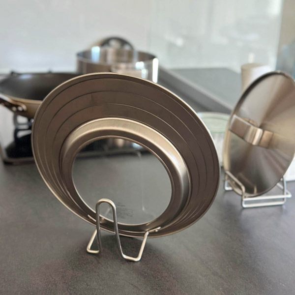 清潔で機能的。これが家事問屋の台所道具。常に衛生的に扱える丈夫なステンレス製で、余計な装飾を持たせない端正なデザインが好印象。それぞれの用途が明確なため使いにくさが全くなく、使い手目線にこだわった機能性は快適そのものです。金属加工の産地、燕三条の地に根差す職人さんが生みだす、働きもので長く付き合える頼もしい道具たちが日々の台所仕事を楽しい時間に導きます。○ フライパンや鍋の蓋、収納に困っていませんか?