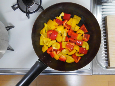 子供も好きなパプリカのポン酢和え。ごま油で炒めたらポン酢とだし醤油で和え、しばらく放置で完成。ほかのフライパンで作ったことがないので比較できないけど、熱伝導の良さで時短できているはず!基本茶色い我が家の食卓に彩りプラスの定番おかずです。