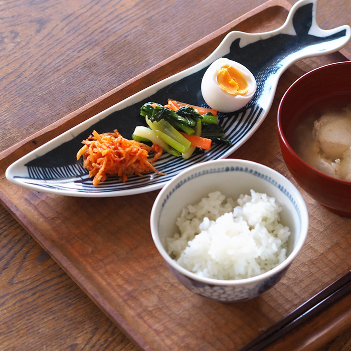 最近また注目度が上がっているクジラのお皿。わたしも韓国ドラマ「ウ・ヨンウ弁護士は天才肌」を観てから(このドラマ大好き)再びクジラが気になるアイテムになりました。なかなかの変形皿ですが、手長皿は大きさも程よくあるので朝食のおかずをちょこちょこ盛り付けるのにぴったりです。呉須の色も馴染み深く落ち着きます。食卓に悠々と泳ぐクジラはその存在感だけでほっこりのお皿です。