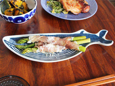 長皿は焼き魚以外にも前菜のプレートで活躍!アスパラを切らずに盛りつけるだけでちょっとおしゃれな前菜のできあがり。豆皿のクジラと合わせて餃子とタレを入れて親子クジラで使うのもいいですね。