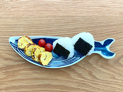 在宅勤務しながら1日3食つくるの、ほんと大変!もともと料理がそんなに得意でない私にとっては毎日修行のようで心を無にしてしのいでいます。お昼ご飯は牛丼、カレー、冷凍チャーハン、市販のソースを使ったスパゲッティなど簡単お昼ご飯をローテーションにしています。おにぎりと卵焼きの組み合わせもこのそのうちのひとつ。katakataのくじら皿にのせると可愛く見えるし、子どももテンションあがってぱくぱく食べてくれます。