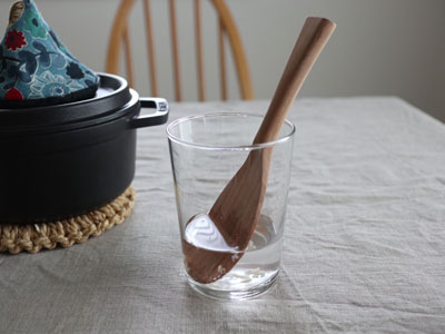 ボデガは飲み物用にちょうどいいけれど、他に使い道がないか・・と思いついたのが、しゃもじ置き! 木のしゃもじは使う前に水で濡らすとごはん粒がつきにくいですよね。かといって毎回使う度に水に濡らすのも面倒。であれば、水を入れたグラスをしゃもじ置きにしてしまえば、置き場所にも困らないし、ごはん粒がつくストレスも軽減されて一石二鳥!! しゃもじの長さに対して、このボデガ500の高さが一番ちょうどいいですよ。