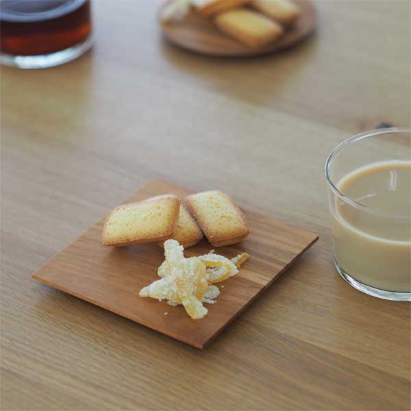 プロキッチンオリジナルの木のお皿はシンプルで、使い方は自分次第です。サイズ的に和菓子などのお菓子プレートにちょうどいいですが、ソーサーとしてよく使います。ミルクコーヒーとチョコでひといきつくのにもちょうどいいです。平らで重なるので収納にも困りません。