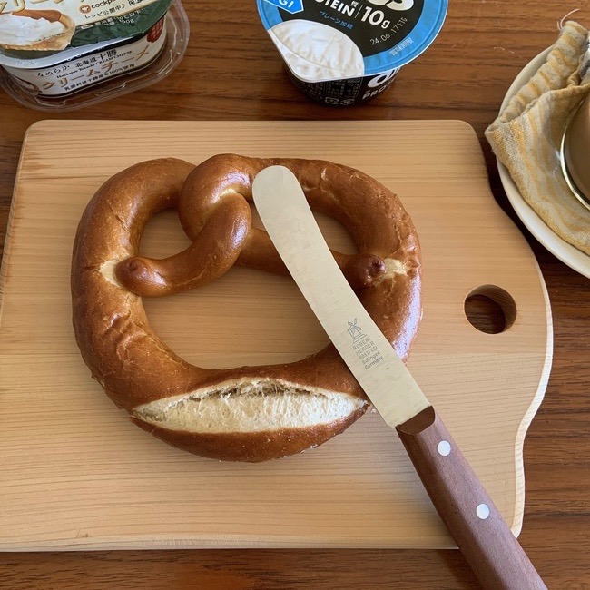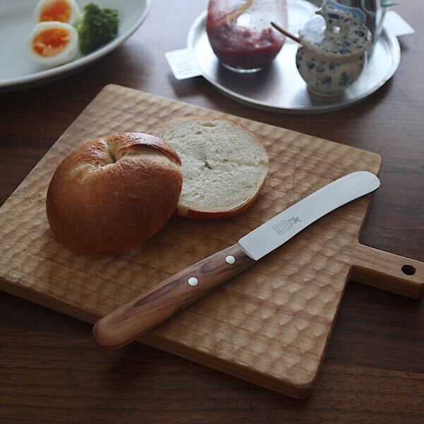 朝ごはんにパンを食べるとき、パンを切ってバターやジャムを塗って・・とそのたびにナイフやスプーンを使い分けるのがちょっと面倒だったりするんですよね。そんなときこのナイフがあれば、切ってすくって塗っての作業がこれ1本でできちゃいます。しかも切れ味抜群!木の取っ手が持ちやすくおしゃれなので食卓にそのまま出しておいても様になります。