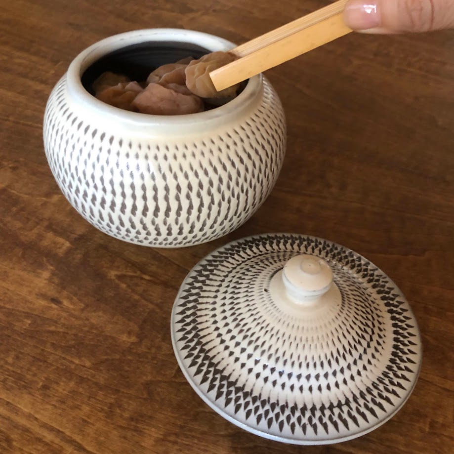 ころんとした丸みと、飛びかんなの模様が美しい、小鹿田焼・小袋窯の2合壺。梅干しを入れるのにちょうどいいサイズ感で、ふたを開けるたびにほっとするような、どこか懐かしい雰囲気が広がります。手になじむほどよい大きさと可愛らしいフォルムは、そのまま器ごと出しても絵になり、いつもの食卓をぐっと引き立ててくれます。毎日のごはん時間に、手仕事のあたたかさを感じられるうつわです。