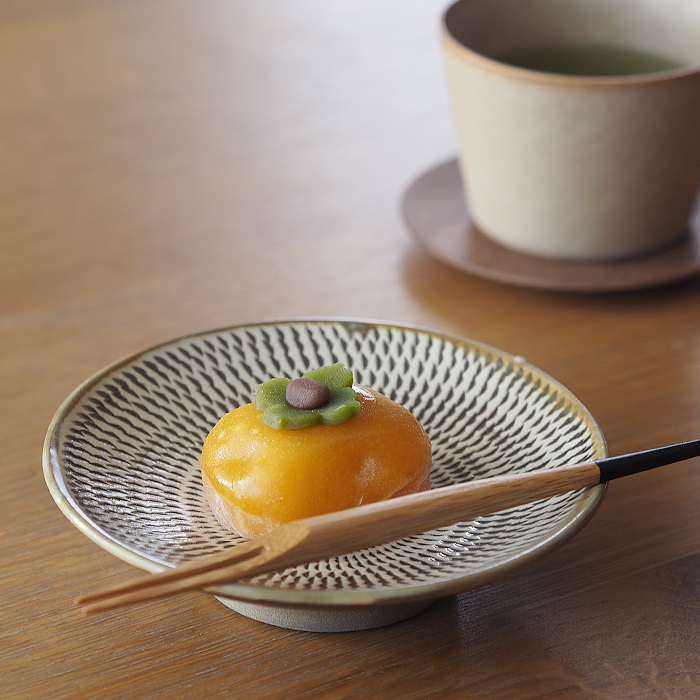 ここ数日秋晴れの気持ちの良い朝が続いています。空を見上げればうろこ雲、ようやく秋がやってきたようです。和菓子屋さんで目に付いたのは「富有柿」という名前の中に白あんと柿の種を思わせる花豆の入ったお菓子。菓子皿はこちらをチョイス。「小鹿田焼の里には柿の木があったかしら。」と窯元を訪れた時を思い出しながら、丁寧に入れた緑茶と一緒にいただきます。自然が生み出した器だからこそ、柿を模したお菓子がしっくりくる気がして、穏やかな気持ちになりました。
