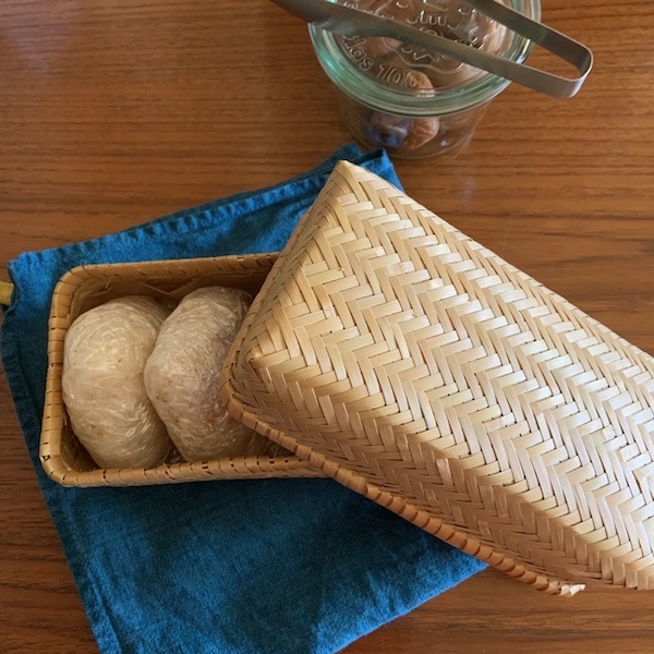細めのひごを使い丁寧に編みこんだ竹製のお弁当箱は軽くて通気性がよく、内部が蒸れにくいので蓋をあける時まで美味しく保存することができます。ちょっとしたピクニック気分を楽しめるため、毎日のお弁当箱としてだけでなく、よそいき感を演出したい日のお弁当箱としてもおすすめです。素材となる竹の青々とした色は月日とともに薄らいでいき、次第に黄色味を帯びてきます。またとうもろこしの繊維を使って丁寧に編み込んだ素朴な鍋しきも天然素材ならではの優しい色合いと柔らかな手触りが心地よく、使いつづけるうちに変化する風合いも楽しみのひとつです。