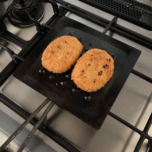 鉄のトーストパンで焼くパンは感動的な美味しさだけど、他の物も普通に温めるよりも全然おいしくなるんです。たとえばコロッケ。平らなフライパンよりも油が出ず、ポッチの部分がカリっと焼きあがって中がふんわり温まるから、サクっサクっとおいしく食べれますよ。とにかく軽いのでさっと手に取って使えるのがいいんですよね。キャンプでの朝トーストにぜひ使ってください!
