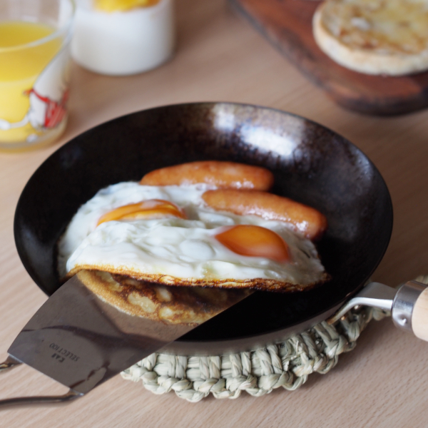 使い始めて今年で6年目のフライパン。買ったばかりの時は灰色がかった鉄の色だったのですが、すっかり黒光りするフライパンになりました。汁気の多いものを調理すると少しカサカサになることもありますが、そんな時は油ならしをしたりしながら使っています。ベーコンもカリカリに焼ける頼もしいフライパンです。