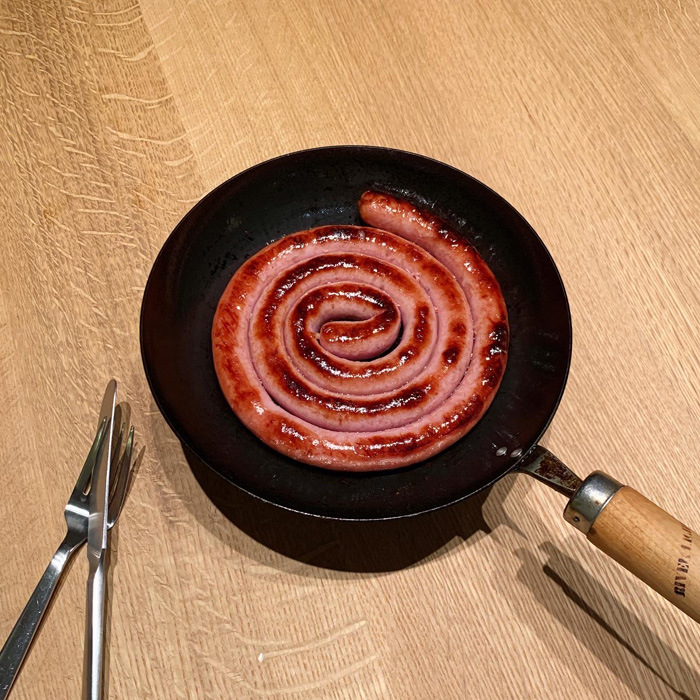 鉄のフライパンで焼くことで、より一層美味しくなる食材があります。そんな時は表面加工派の私もリバーライトのフライパンを出します。中でも20cmは気軽に出せて、ソーセージやベーコン、野菜などを焼いて「そのままテーブルへ」が出来るサイズ感。この日はグルグルと渦巻きになっているソーセージを丸ごと焼きました。熱々のまま食卓へ!家族も盛り上がっています。鉄なら直接フォークとナイフで切り分けてもへっちゃら。うーん、パリッとジューシー!