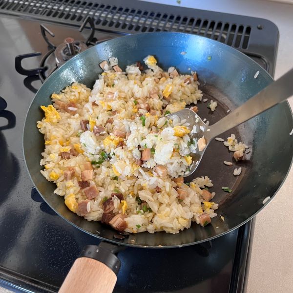 鉄フライパンはいくつも持っていますが、リバーライトは「柄が木なので熱くならない」というのが手に取りやすく、急ぎの時はよく使います。焦げ付かないポイントは、フライパンを温めたら一度火を消し油を全体にまわして再度中火にして調理を始めること。最初に卵をジャーっと入れ、半熟の状態で軽く温めたごはんを入れて手早く混ぜましょう。強火にしないからあわてなくても大丈夫。べちゃっとせずパラパラに出来上がりますよ。