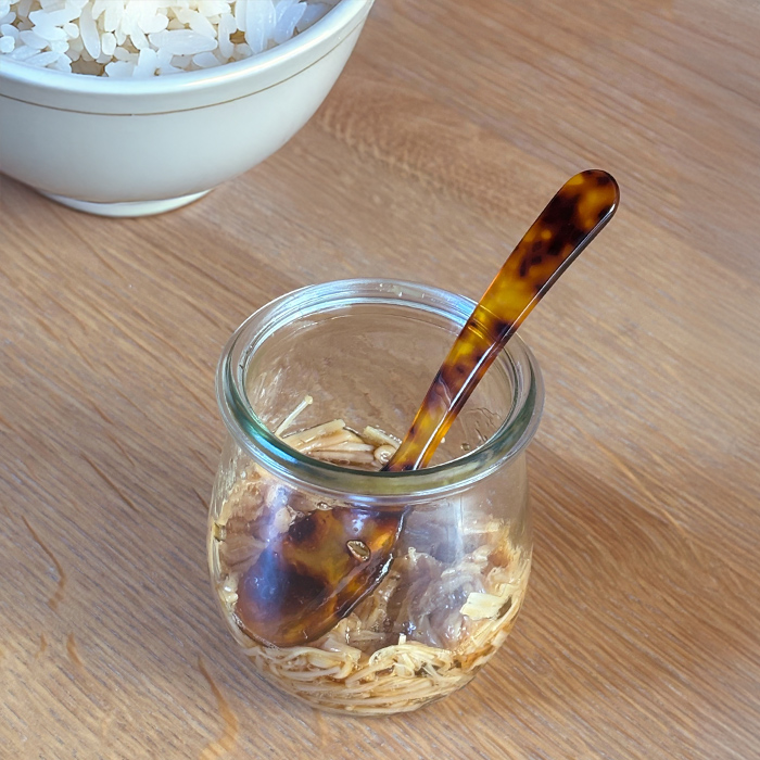 先日、オフィスでご飯を食べたていたとき三木がご飯の共にどうぞとなめ茸を分けてくれました。そこに添えられていたハイムゾーネのスプーンが使いやすく、素敵で思わずパチリ。ハイムゾーネのスプーンはカラフルで気分や食卓のトーンによって使い分けられるのが新しいですよね。このベッコウのような落ち着いた色味から、ウキウキするような色味まで全17色(2025.1現在)揃っているので、選ぶ時間も楽しいです。三木がくれたなめ茸はもちろんご飯が何杯でもいけるお味でした!