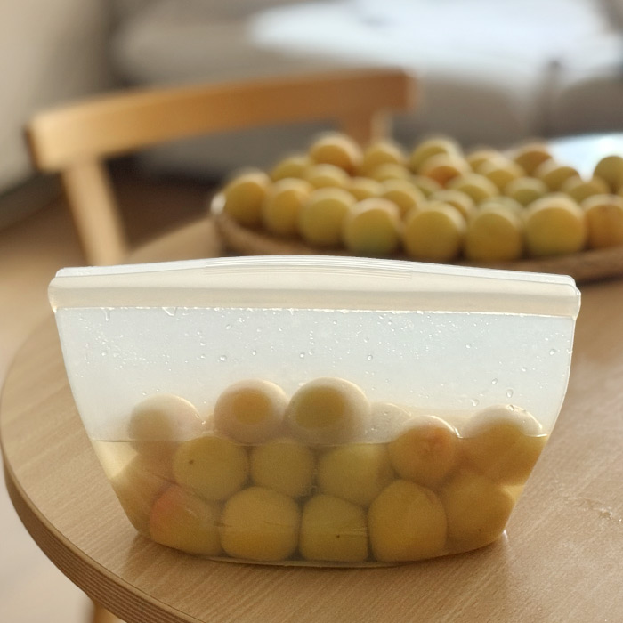 梅仕事の季節がやってきました。今年は梅ジンジャーレモンシロップを多めに作る予定。梅シロップの青梅は、冷凍した方が繊維が壊れ、エキスが早く抽出できると聞いてからは、ヘタ取りをした後、青梅を冷凍するようになりました。冷凍保存に最適なのはスタッシャー!スタンドアップタイプはマチがあるので、青梅のようなゴロゴロした実も気にせず入れることができます。このサイズで1kg入りますよ。青梅の季節が終わっても、また好きな時期に梅シロップ作りができるので、余分に冷凍しておくことをおススメします。