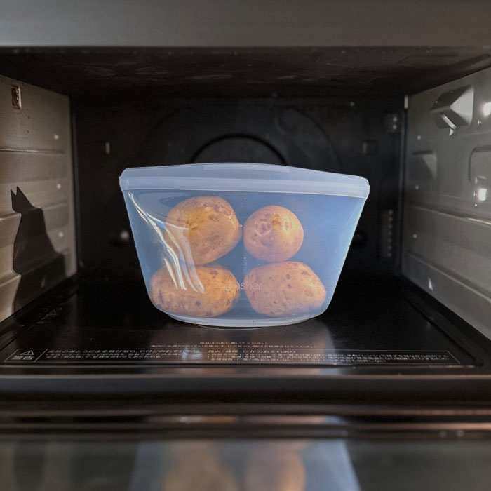 「ジャガイモを蒸すのはスタッシャーで!」覚えておいてください。スタッシャーはエコなアイテム。でもそれだけじゃない。シリコンの質が高いことと、独自のピンチロックシステムで密閉できるのにレンジで加熱した際に圧力が高まると自然と開いて蒸気を逃して爆発しないんです。この丁度いい密閉と圧力を下げる仕組みでジャガイモを蒸すのにピッタリ。短時間で美味しくホックホクに蒸しあがるため、これ一択です。ジャガイモ4つなら600Wで8分ほどで蒸しあがります。今夜はポテトサラダ!