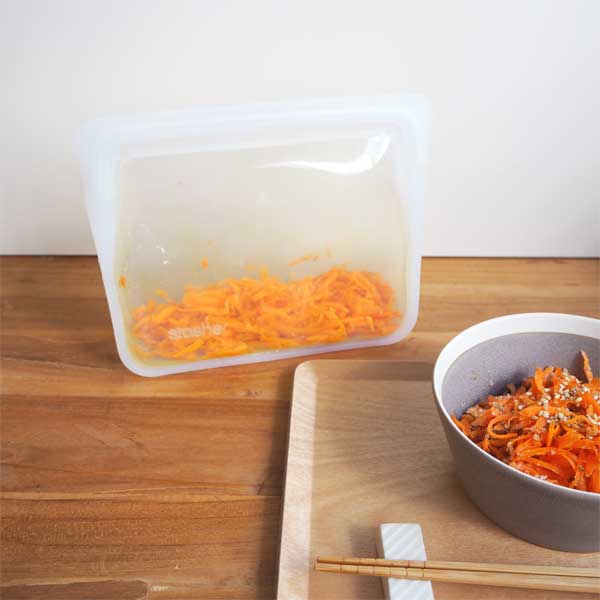 テイクアウトのお弁当では野菜が足りていないな…と思ったので、蜂の巣ジュジュで人参をシリシリしてスタッシャーに入れ、塩少々とシェイク。水分が出たらスタッシャーの中で絞り、ごま油とすりごまで和えてモリモリ食べました。少し加熱すると人参の甘みが引き立ちます。手軽にサラダや和え物ができるスタッシャーはずぼらな私の味方です。