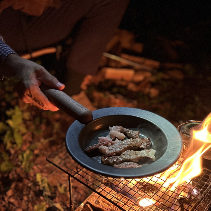 夏休みにキャンプに行ってきました。今回のメインは地元スーパーで調達した地元牛のステーキ。今回初めてキャンプでジュウを使ってみましたが、火加減のちょうど良いところにパンを置いても、持ち手が取り外せるのでアチチとならず超便利ー!家でも使っている本格派フライパンなのでもちろん焼き加減もバッチリ。水で流しながらスコイで擦れば汚れも簡単に取れました。翌朝はジュウを使ってのホットケーキ。「ジュウと炊飯用のメスティンで十分だね」とキャンプ好きの夫も納得のフライパンです。