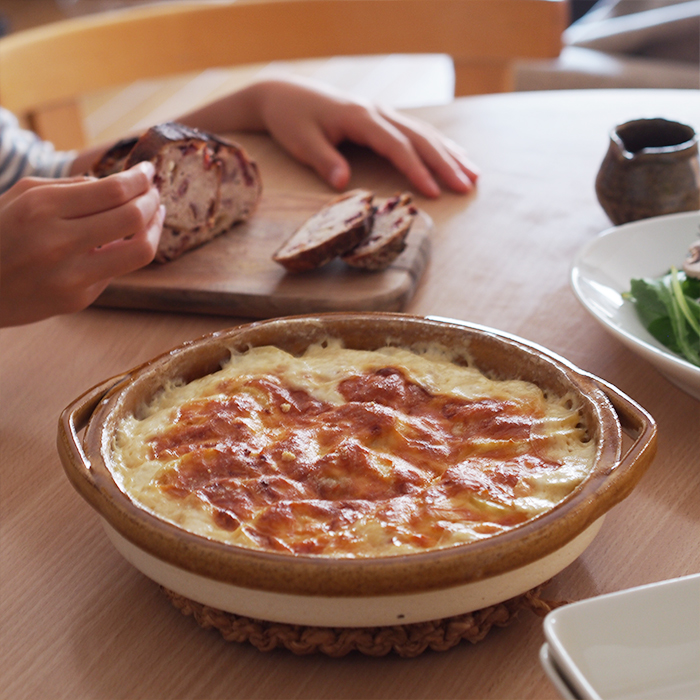 家族が大好きなポテトグラタン。ジャガイモ3個をスライスし、スタッシャーに入れて電子レンジで10分。ホックホクに柔らかくなったジャガイモをプレートに敷き詰めて、生クリームと茅乃舎の野菜だしを一袋入れ、シュレッドチーズを散らしてオーブンへ。表面に焼き色がついたら完成という簡単レシピです。このグリルパンの深さがちょうど良いのです。直火OKなので、ハンバーグに焼き目を付けてからオーブン調理して、そのままアツアツを食卓へ。レストラン風な演出もできますよ。