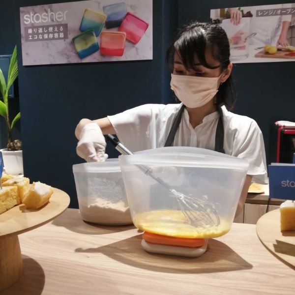 スタッシャーのイベントに参加してきました。管理栄養士・米粉料理家の中村りえ先生がその場で作ってくれたヨーグルトとレモンのケーキが美味しかった~♪ スタッシャーの中で混ぜてそのまま焼くので洗い物が少なくてラクチン。爽やかなケーキは冷やしても美味しいとのこと。作り方を見ていましたが、はかりの上にボウルLをのせ、材料を測りながら混ぜていくだけ。あとはオーブンで焼いて取り出せば出来上がりです!暑い日に簡単にできる爽やかなおやつ、私も作ってみたくなりました。レシピはスタッシャー公式ページにありますよ。小麦粉の保存にも便利です。