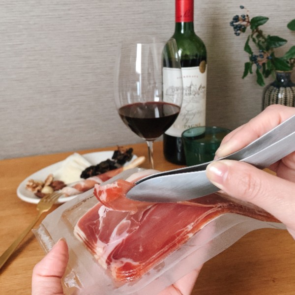 みなさん、生ハムをはがすときにちぎれちゃって、泣く泣く細切れの生ハムをつついた経験ありませんか?今年に入ってから薬味用に買ったオークスごはんのおともトングなのですが、これが生ハムをはがすときにもってこいということに気づきまして。緩やかなカーブ側を生ハム側に沿わせながらやさしく剥がすと、しっかり張り付いた生ハムもなんとかばらばらにならずに剥がすことができるので是非お試しを!