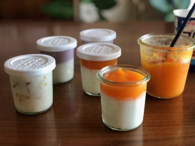 朝食のヨーグルトは、ウェックに移し冷蔵庫に用意しておきます。プレーンをベースにフルーツのピューレを乗せたり、別の味のヨーグルトを乗せたり、ドライフルーツを混ぜたり。5個分を一度に用意し、それぞれが冷蔵庫から選ぶことにしたので、朝の用意が楽になりました。家族にも好評です。