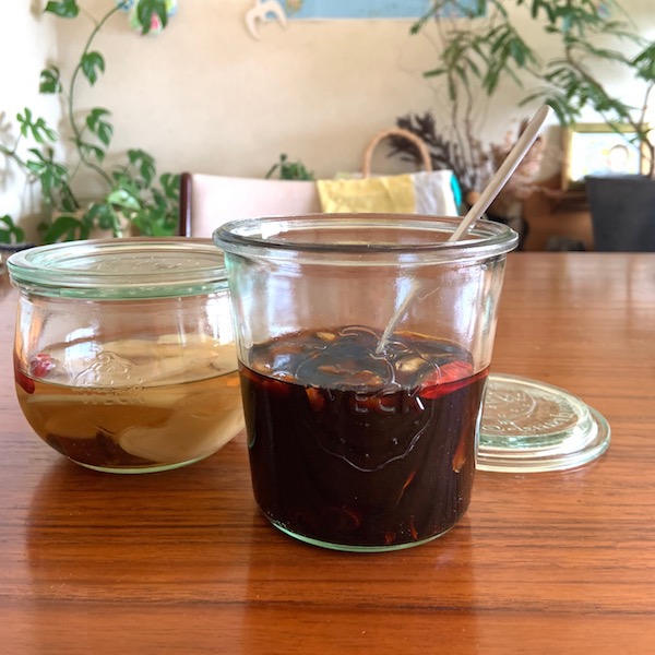前から作ってみたかったジンジャーシロップに初挑戦。辛口のシロップを作りたかったので、シナモン、鷹の爪、クローブなどのスパイス入りに。甘みをつける砂糖の種類は最後まで悩みグラニュー糖と黒糖で作ってみました。もともとジンジャーエールは好きなのに加えて、冷え性の改善効果も期待して毎日飲んでいます。ウェックのガラス蓋は開け閉めに手間取らなくて◎です。