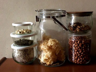 お店で食べたものを家でも作ってみたくて、いつの間にかいろいろな種類の乾物が増えてきました。乾物を入れたガラス瓶を目に付くところに置いておけば、使い忘れることもないですよ。WECKのガラス瓶はサイズが豊富でとても使いやすいです。