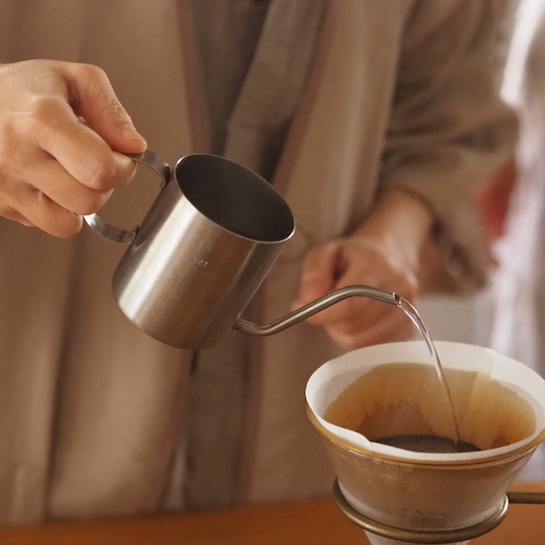 それまでドリップポットとして使っていたオパのケトルは細くお湯が注げるけれど、気を抜くとドドドド〜っと大量のお湯を注いでしまったりして湯量のコントロールが難しい。で、スタッフ受けの良いワンドリップポテを使ってみたのです。細く長いノズルから一定量のお湯がリズムよく出てくるのは本当に素晴らしい。寝起きのボケボケ頭でドリップしてもいつも同じ味に仕上がります。さらに、オールステンレスのミニマルデザインもキッチンのノイズにならずいい感じです。