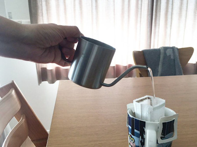 在宅勤務時に、気分転換に家でコーヒーを淹れることが増えました。でも夫はそんなにコーヒー飲まないし、1杯だけ淹れることがほとんど。ドリップポットを使うほどではないのでワンドリップポテが活躍しています。沸かしたお湯をワンドリップポテに移すことで適温になり、1杯分の量も測れて細ーく注げます。