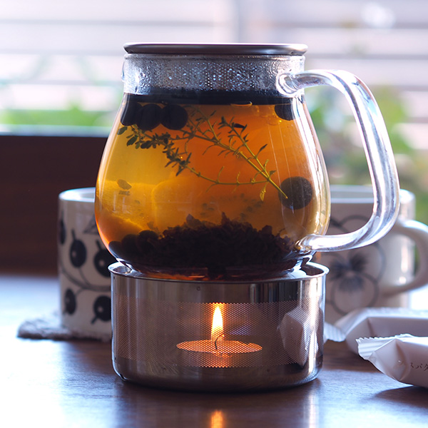 以前八ヶ岳倶楽部で飲んだフルーツティーが美味しくて忘れられず、家でもたまにフルーツティーを飲むようになりました。あの森を眺めながらいただくからこその美味しさもありますが、少しでも近づきたくてティーウォーマー導入しました。フルーツはその日にあるもの、茶葉は八ヶ岳倶楽部でも使用しているニルギリ。やさしい熱であたためながら味の変化を楽しむ安らぎ時間です。